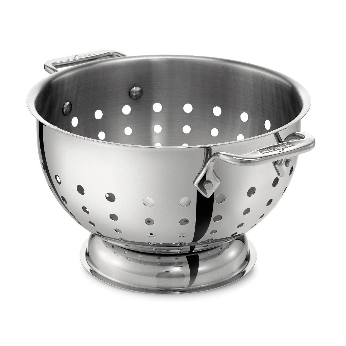 Divide and conquer at meal time! Drain or rinse those veggies, noodles, and more in the 3-Quart Silver Stainless Steel Colander by All-Clad – just one of many exceptional cooking tools from the world-renowned All-Clad cookware collection. Take to heavy loads in the sink or over the counter with the easy-to-grip riveted handles that provide noticeable comfort and a firm hold when rinsing or carrying from place to place in the kitchen. Better yet, the strainer has 18/10 stainless steel to keep it from staining and corroding over time, no matter how acidic the foods involved are, while remaining absolutely durable for long-term use you can count on. Brushed on the inside but polished on the outside contributes to the silver colander’s attractive mirror-like finish that just makes you want to take a moment to just look at it. But notice the holes spread throughout the colander: each of the graduated holes allow for quick drainage and plenty of airflow for helping to cool off food. No worries about the colander tipping over, thanks to the highly stable pedestal base there to remain level. Yes, that’s right, even if you’re having macaroni and cheese for lunch once again, there’s no better tool to use than the All-Clad Silver Stainless Steel Colander to separate those small but delicious noodles … but maybe some beef stir fry tomorrow.