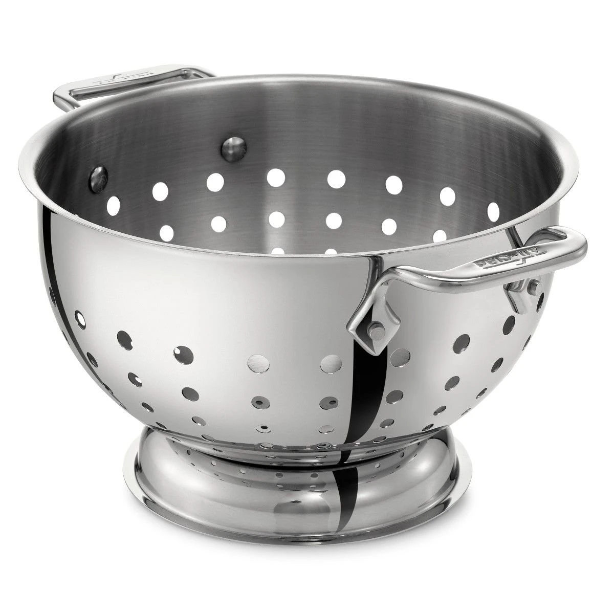 Divide and conquer at meal time! Drain, rinse, or store those veggies, noodles, and more in the 5-Quart Silver Stainless Steel Colander by All-Clad – just one of many exceptional cooking tools from the world-renowned All-Clad cookware collection. Take to heavy loads in the sink or over the counter with the easy-to-grip riveted handles that provide noticeable comfort and a firm hold when rinsing or carrying from spot to spot in the kitchen. Better yet, the strainer has 18/10 stainless steel to keep it from staining and corroding over time, no matter how acidic the foods involved are, while remaining absolutely durable for long-term use you can count on. Brushed on the inside but polished on the outside contributes to the silver colander’s attractive mirror-like finish that just makes you want to take a moment to just look at it. But notice the holes spread throughout the colander: each of the graduated holes allow for quick drainage and plenty of airflow for helping to cool off food. No worries about the colander tipping over, thanks to the highly stable pedestal base there to remain level. Yes, that’s right, even if you’re having spaghetti for dinner once again, there’s no better tool to use than the All-Clad Silver Stainless Steel Colander to separate those glistening strands of delicious noodles … but maybe potatoes tomorrow night.