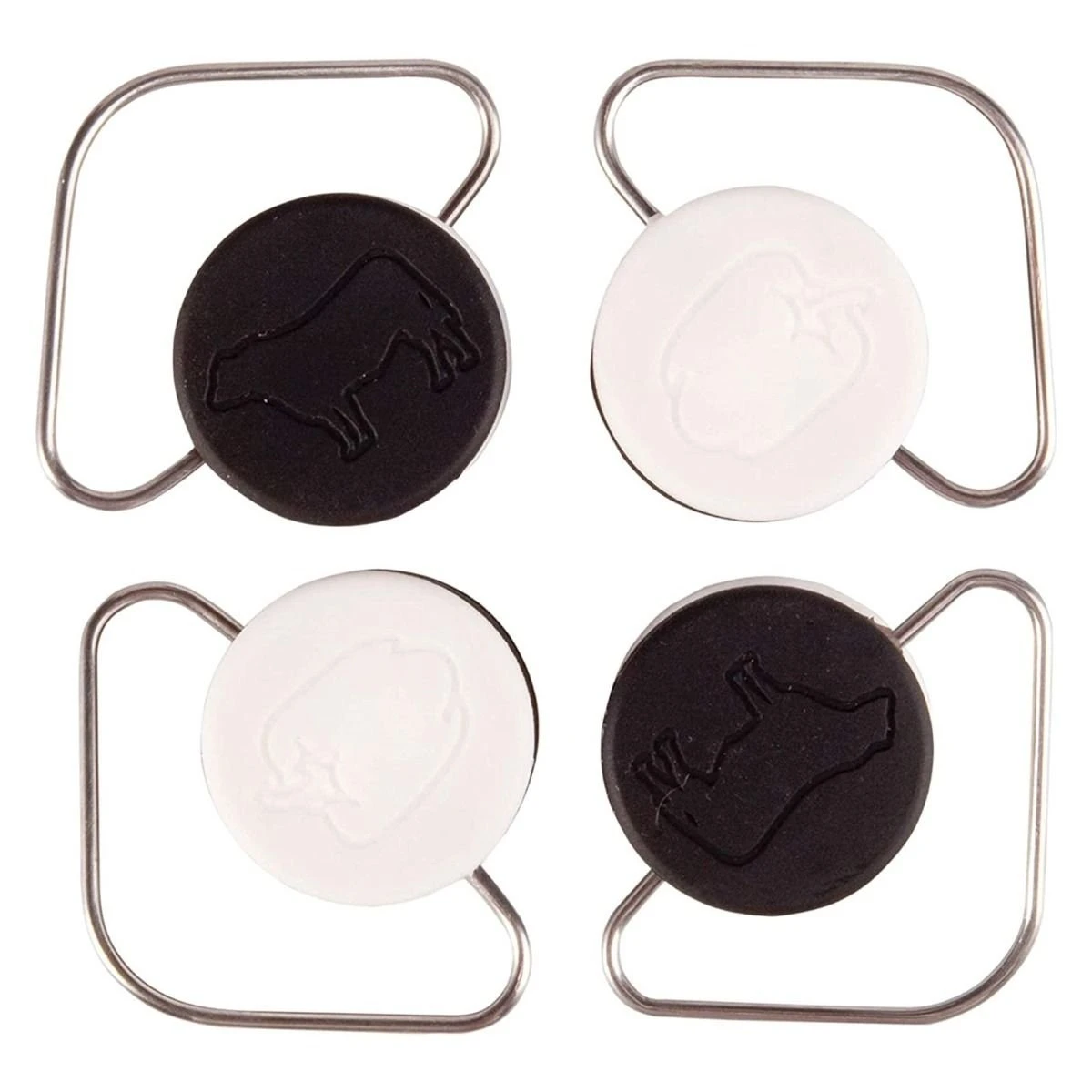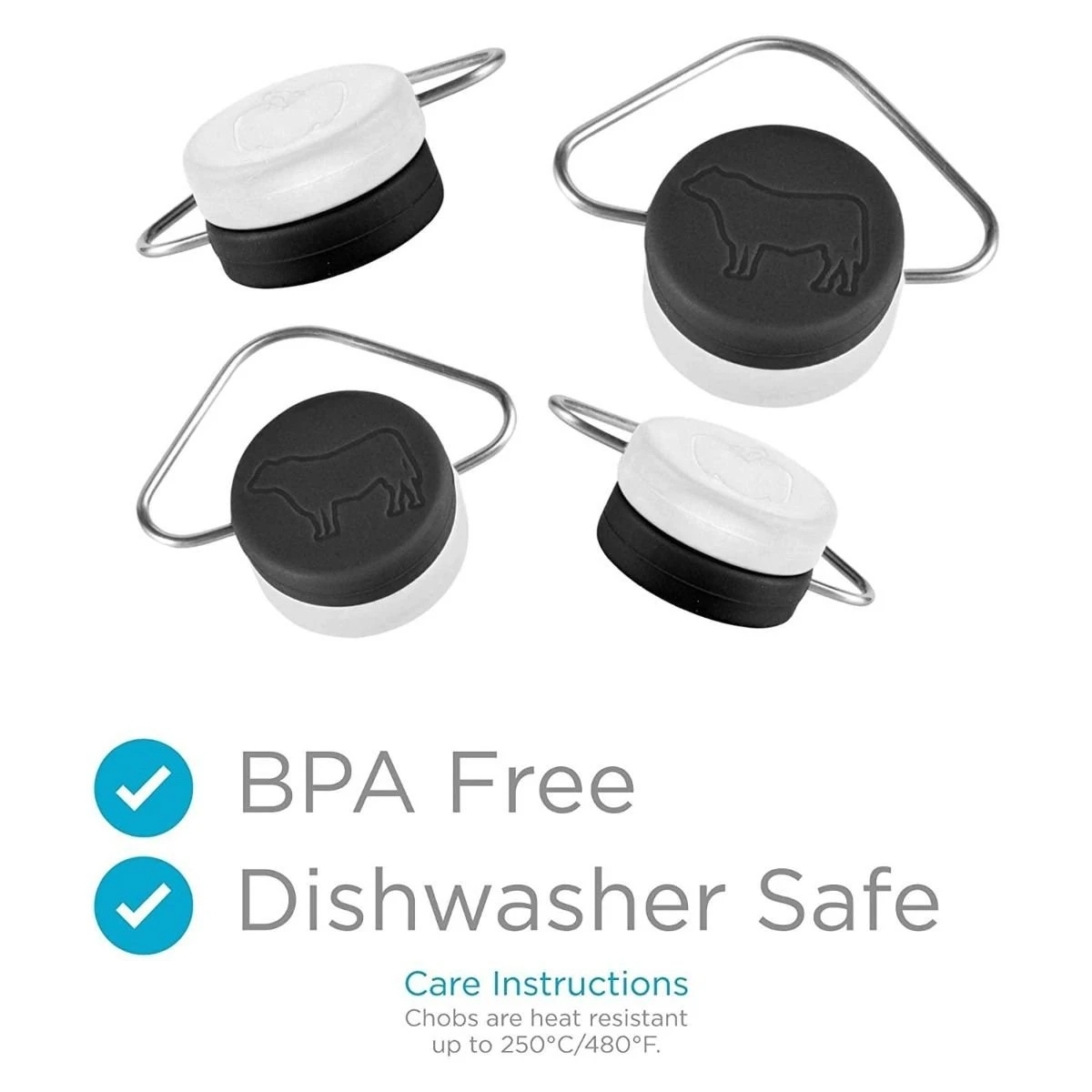 Make prepping for stir-fry night a breeze with Dreamfarm Chobs Non-Slip Chopping Board Feet in Black and White. Chobs allow you to raise any cutting board and utilize both sides without dirtying your countertop. Chop meat on one side and veggies on the other without the risk of cross-contamination – the black feet are engraved with a cow while the white feet are engraved with a bell pepper so there is no risk you will forget which side is which. The non-slip silicone feet prevent your board from slipping, so you can slice steak for a date night in or carve a chicken without the board sliding. The steel spring allows Chobs to fit around almost any thickness cutting board, making it perfect for any kitchen. Make the most of your cutting board with Dreamfarm Chobs Non-Slip Chopping Board Feet in Black and White.Â