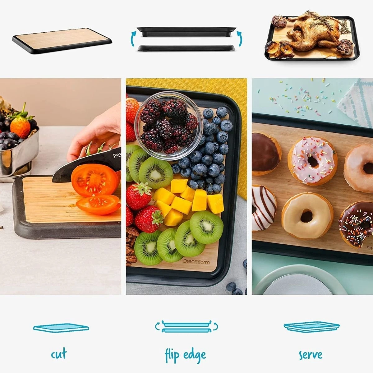 - Unique flip-up edges prevent food from falling off while chopping, transferring & serving, allowing this cutting board to also be used as a tray