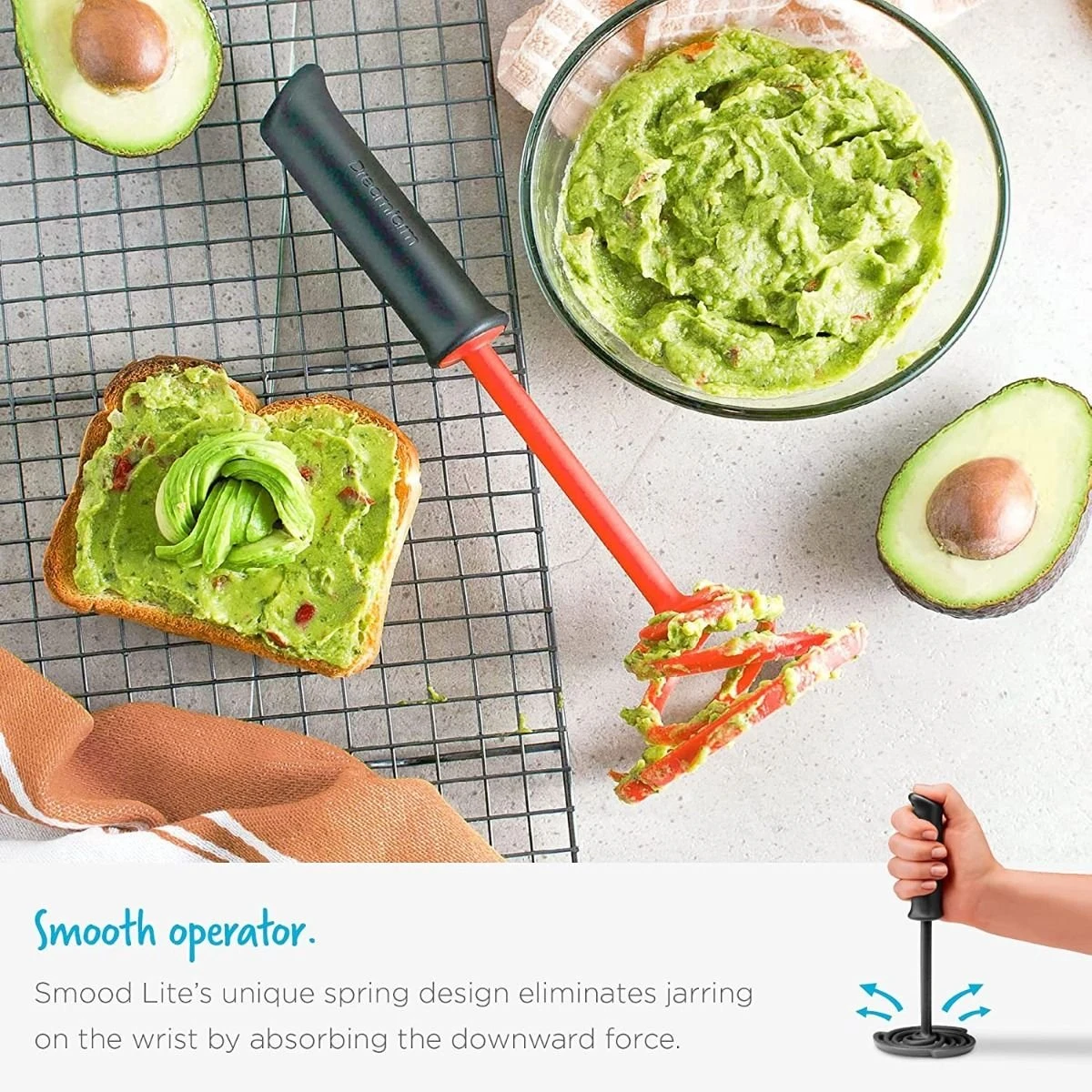 Mash up those boiled potatoes without having to use expensive hand beaters or immersion blenders with the Dreamfarm Smood Lite in Black! Made from non-stick safe nylon, its durable construction and unique design make it the BEST potato masher in the world. You place it directly above your potatoes, avocados, and whatever food you are smashing and press down to trap the food to make instant mash. The spring coil action eliminates unnecessary jarring on the wrist as you instead use the downward force, and its ergonomic handle allows you to hold it in several different ways for a true custom grip for anyone. The nylon material has a heat resistance of up to 400°F, and the edges of the spring let you scrape every last bit of mash in your mixing bowl, pot, or pan. When you are done using the Smood Lite, remember to rinse it well and set it in the dishwasher for an easy clean. The Dreamfarm Smood Lite will become an instant smash hit in your kitchen!