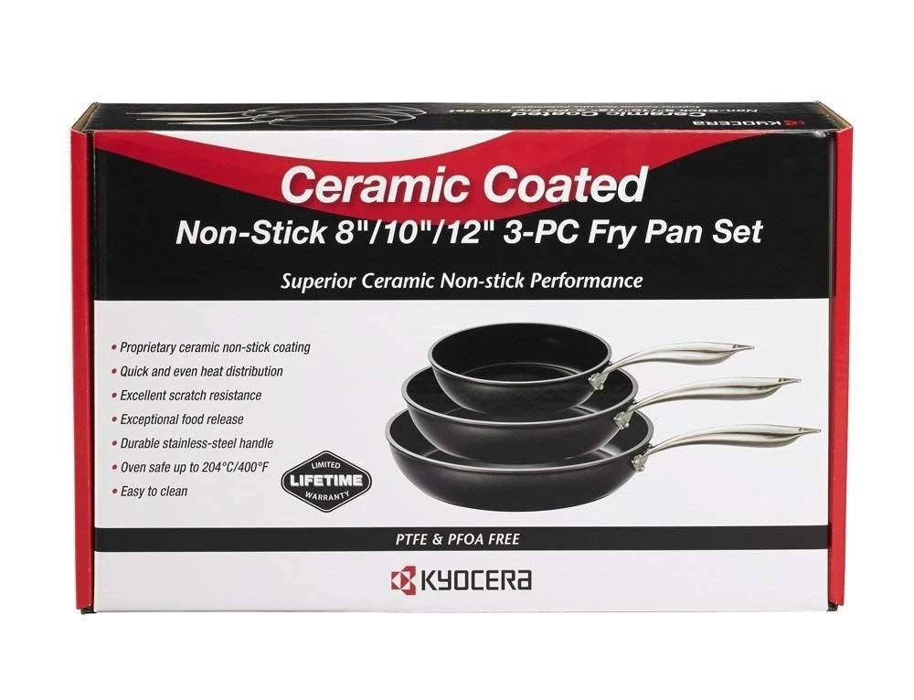 Fry up some crispy bacon, delicious eggs, or yummy hashbrowns in this Kyocera Ceramic Non-Stick 3pc Fry Pan Set! The sturdy riveted professional stainless steel handle of the 8-in, 10-in, and 12-in fry pans allow you to multitask, getting a hot meal on the table quickly. These fry pans are non-stick, scratch-resistant, and easy-to-clean so that you can use repeatedly throughout the day. Made of heavy gauge aluminum with a stainless steel bottom plate, this durable fry pan set is oven-safe up to 400°F and ensures quick and even heat distribution. Whether you are cooking up breakfast for dinner or creating family recipes, your new Kyocera Ceramic Non-Stick 3pc Fry Pan Set with an 8-in, 10-in, and 12-in fry pan will serve you and your family well for years to come.