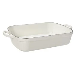 - 5.25-Quart Signature Roaster:Â Bake family-sized lasagnas or oven-roasted chicken & vegetables in this beautiful roasting pan. The signature sand-colored enameled cast iron interior provides incredible heat distribution that’ll cook, bake, or roast food to perfection. The large loop handles make moving this roaster from the oven to the table easy, so you can bake and serve family favorites all in one dish.