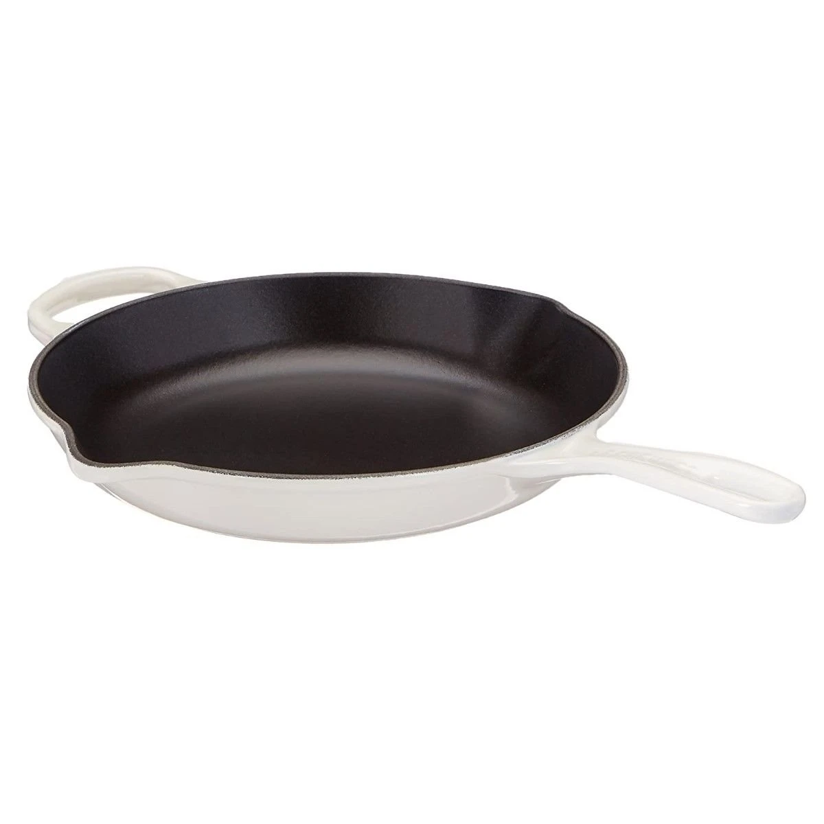 - 10.25â Signature Skillet: Baking, sautĂ©ing, and frying delicious food is easy and fun with the Signature Iron Handle 10.25â Skillet from Le Creuset. This enameled cast iron frying pan will become a staple in your daily cooking routine. It only gets better with age, too; over time a natural patina develops on the black enamel that is ideal for either searing or frying. This also means there is no need to season the cast iron. There is a large handle and a convenient helper handle on the opposite side to assist when carrying between the oven, stovetop, and table.