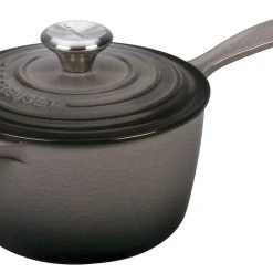 Safety features such as a lift handle and large phenolic knobs provide thoughtful handling features. Knobs are easy to grab even with a bulky oven mitt. Sand-colored interior enamel on both the sauce pan and round oven casserole provide precision monitoring of multi-textured ingredients. Because of the thermal resistance, Le Creuset 5-Piece Signature Set in Oyster Grey is ideal for baking, serving, and freezing food as a multi-task vessel.