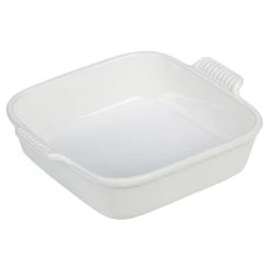 - Le Creuset 3 Qt. Square Heritage Dish | White – Made with the same legendary stoneware used in all of Le Creuset’s bakeware, this distinctive baking dish recalls designs of the 1930s and 1940s with its traditional scalloped side handles. Like all Le Creuset stoneware, it maintains even temperatures and prevents hot or cold spots, and cooks food uniformly, so everything you make bakes up just how you intended! The smooth, impermeable glaze resists staining and is nearly nonstick, so food will release easily. Because the exterior enamel is so durable, you won’t have to worry about chips or scratches. It’s safe for the oven, broiler, microwave, refrigerator, or freezer, and since it resists stains and odors, it’s ideal for preparing your dish and storing it in the refrigerator until it’s time to bake. At 9” Square with high 2.75” sides, this 3-Qt Heritage Square Dish is perfect for baking desserts, layered pasta dishes, or even an ice cream cake!