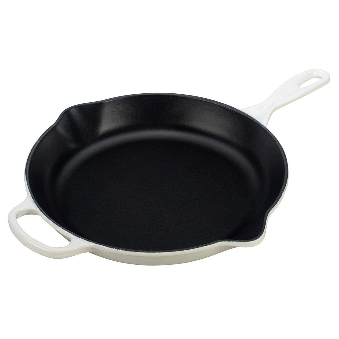- Le Creuset 11.75″ Signature Enameled Cast Iron Skillet | White – This classic piece of kitchen cookware is made from the highest-quality cast iron on the market. The Le Creuset cast-iron skillet has an enamel coating on the inside and out for an entirely non-stick surface. The enamel is easy to clean and is resistant to chipping and cracking. This Le Creuset Skillet has an iron handle to provide a solid grip, and with Le Creuset’s broad spectrum of colors, these fry pans will make any kitchen look great. After several uses, the enamel coating on the inside of the skillet will develop a natural patina that, many chefs believe, can enhance the pan’s ability to sear and fry foods. Le Creuset’s Signature skillets feature a helper handle for easier lifting and added control when moving between stovetop, oven, and table.
