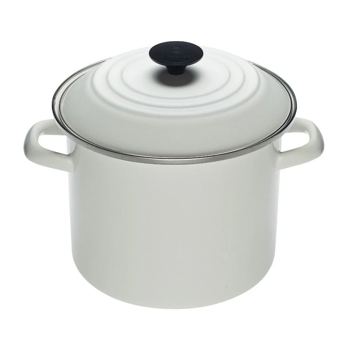 - Le Creuset 8 Qt. Stock Pot | White – Make complex stocks, hearty soups & stews, or a spicy Cajun crawfish boil to bring friends & family together in the Le Creuset enameled 8 Quart Stock Pot. The design of this Le Creuset stockpot limits evaporation causing liquids to mix and bubble together giving your entire dish rich flavor. Safe to use on any heat source from electric to halogen. The stainless steel rim helps to prevent cracking or chipping of the sleek porcelain enamel. Follow simple care instructions to ensure the enjoyment of your Le Creuset 8 qt stockpot for years to come.