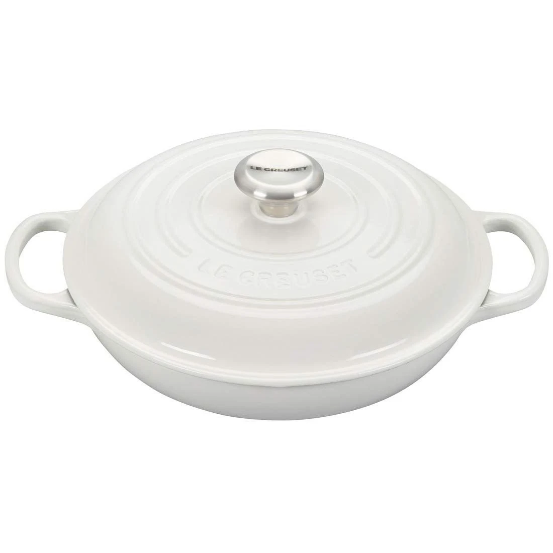 - Le Creuset 2.25 Qt. Signature Enameled Cast Iron Braiser with Stainless Steel Knob | White – Transform even the toughest cuts of meat into tender, juicy dishes with the Le Creuset 2.25-Quart Signature Braiser in captivating White! Known in France as the “everyday pot,” this unique cooking vessel is a fan favorite for its wide range of versatility. With a flat base and tall, curved sides, the Signature Braiser is perfect for searing, roasting, stir-frying, slow-cooking, simmering, braising, baking, and more! With the Signature Braiser, there’s no culinary endeavor you can’t take on. Made of Le Creuset’s time-honored enameled cast iron that provides superior heat retention and even heat distribution to prevent hot and cold spots, this 2.25-Quart Braiser includes a tight-fitting lid with a redesigned stainless steel knob that’s oven-safe up to 500°F.