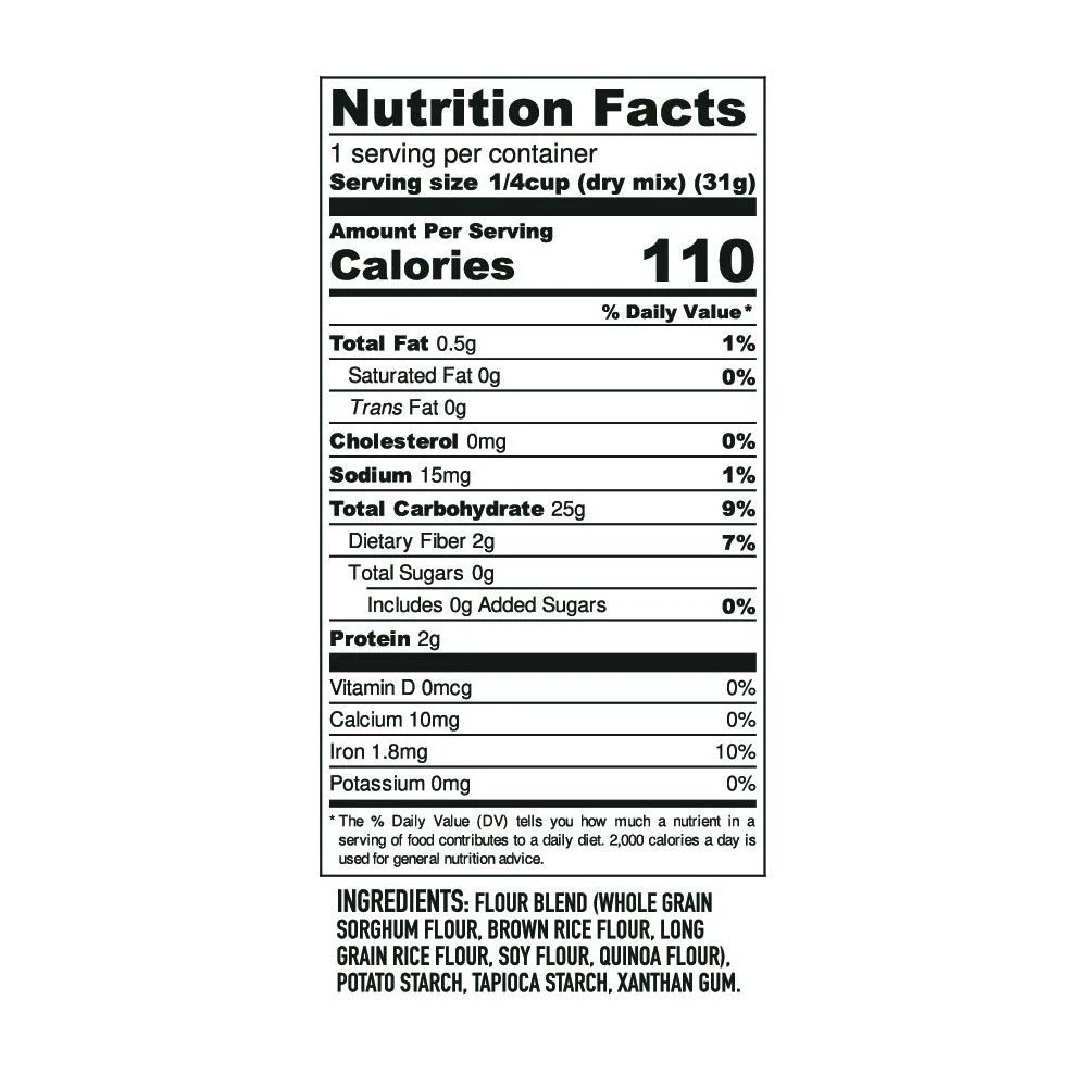 - Ingredients: Potato starch, sorghum flour, brown rice flour, long grain rice flour, soy flour, tapioca starch, quinoa flour, & xanthan gum