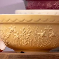 Bring the effortless charm of lush countryside fields indoors with the Mason Cash In The Meadow Collection S30 Mixing Bowl in Daffodil. Made with Mason Cash’s time-honored stoneware that is resistant to chipping and cracking, this mixing bowl will be a durably elegant addition to your everyday baking preparation. With a 1.25 Quart capacity, the S30 mixing bowl is ideal for preparing smaller batches of dough or batter or for serving side dishes. The soft ochre coloring is highlighted with an embossed Daffodil design that lines the bowl’s perimeter, while the classic scalloped rim offers maximum grip – making for a practical, elegant piece that will let mixing tasks go smoother. Let your baking tasks bloom with style and order the Mason Cash In The Meadow Mixing Bowl today!