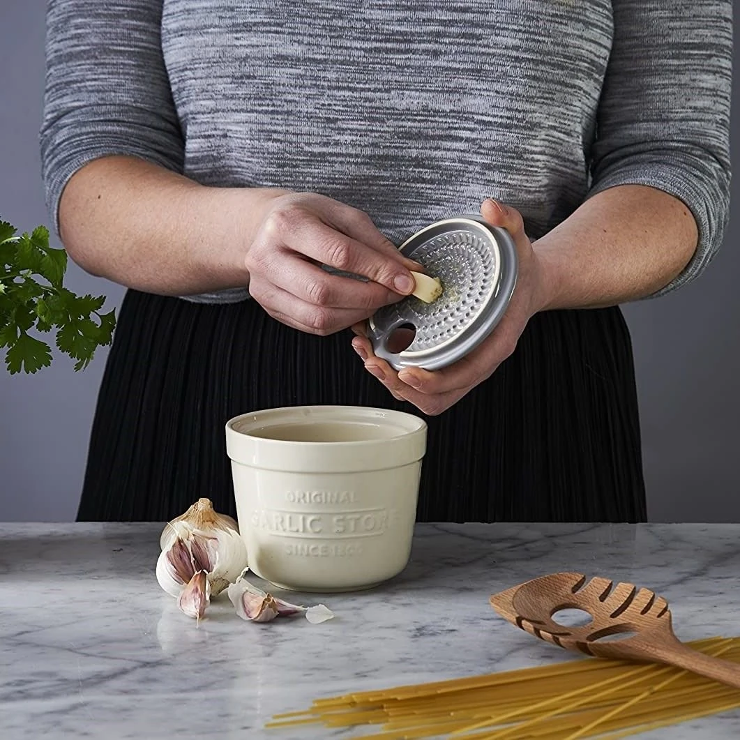 Grate and store garlic and more! In this Garlic Store & Grater by Innovative Kitchen, it’s easy to just take a bag of garlic and store as many as you can in a more functional, simple way. Smart solutions delivered simply and stylishly are what Mason Cash offers with this garlic store & grater. Inside, there are air vents designed to keep garlic as fresh as possible for as long as possible. On top, there is a lid that makes use of a grater for any garlic or ginger you wish to use. After that last bulb of garlic or little bit of ginger stored inside the jar is used, just wash it in the dishwasher for quick cleaning. Storing garlic or ginger should be as easy as can be – this is where the Innovative Kitchen Garlic Store & Grater comes in as a key to your daily kitchen needs.