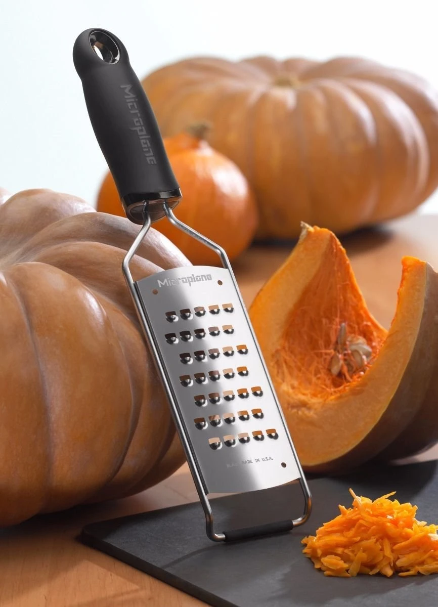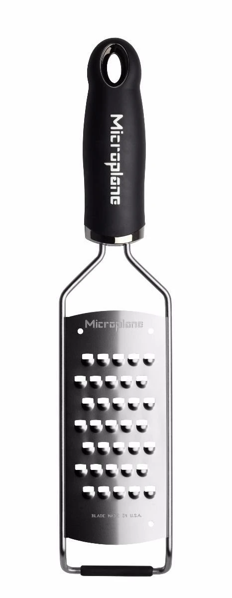 Are you looking for the perfect tool for grating potatoes for latkes, soft cheeses for toppings, and apples and carrots for cake or salad without needing any “elbow grease” to get the job done? Microplane’s Gourmet Series Extra Coarse Grater is the one you’re looking for. The original company to bring the woodworking tool out of the garage and into the kitchen, Microplane’s ultra-sharp blades are photo-etched instead of stamped like most of the competition, so while other graters you’ve used may have seemed dull, a Microplane blade will never disappoint. The graters in the Gourmet Series are paddle graters, used by chefs and gourmands everywhere. A non-slip base keeps the grater safely in place, while a soft-touch handle makes it comfortable to use.  Able to grate any food easily, you’ll be reaching for this extra coarse grater time and again to grate piles of cheddar for a toppings bar, potatoes for hasbrowns, and cabbage for coleslaw.