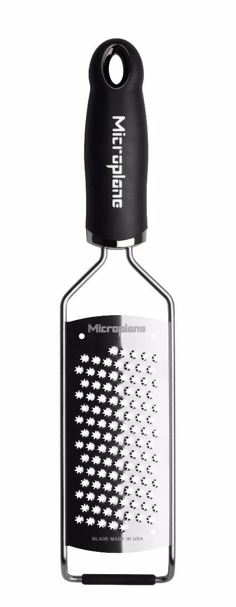Are you looking for the perfect tool for grating hard cheese, chocolate, and ginger into soft fluffy mounds that melt instantly into sauces without needing any “elbow grease” to get the job done? Microplane’s Gourmet Series Star Grater is the one you’re looking for! The original company to bring the woodworking tool out of the garage and into the kitchen, Microplane’s ultra-sharp blades are photo-etched instead of stamped like most of the competition, so while other graters you’ve used may have seemed dull, a Microplane blade will never disappoint. The graters in the Gourmet Series are paddle graters, used by chefs and gourmands everywhere. A non-slip base keeps the grater safely in place, while a soft-touch handle makes it comfortable to use.  Able to grate any food easily, you’ll be reaching for this star grater time and again to grate fluffy piles of Romano cheese onto your pasta, superfine garlic and ginger for stir fry, for tiny bits of zest from citrus for delicate desserts, and more!