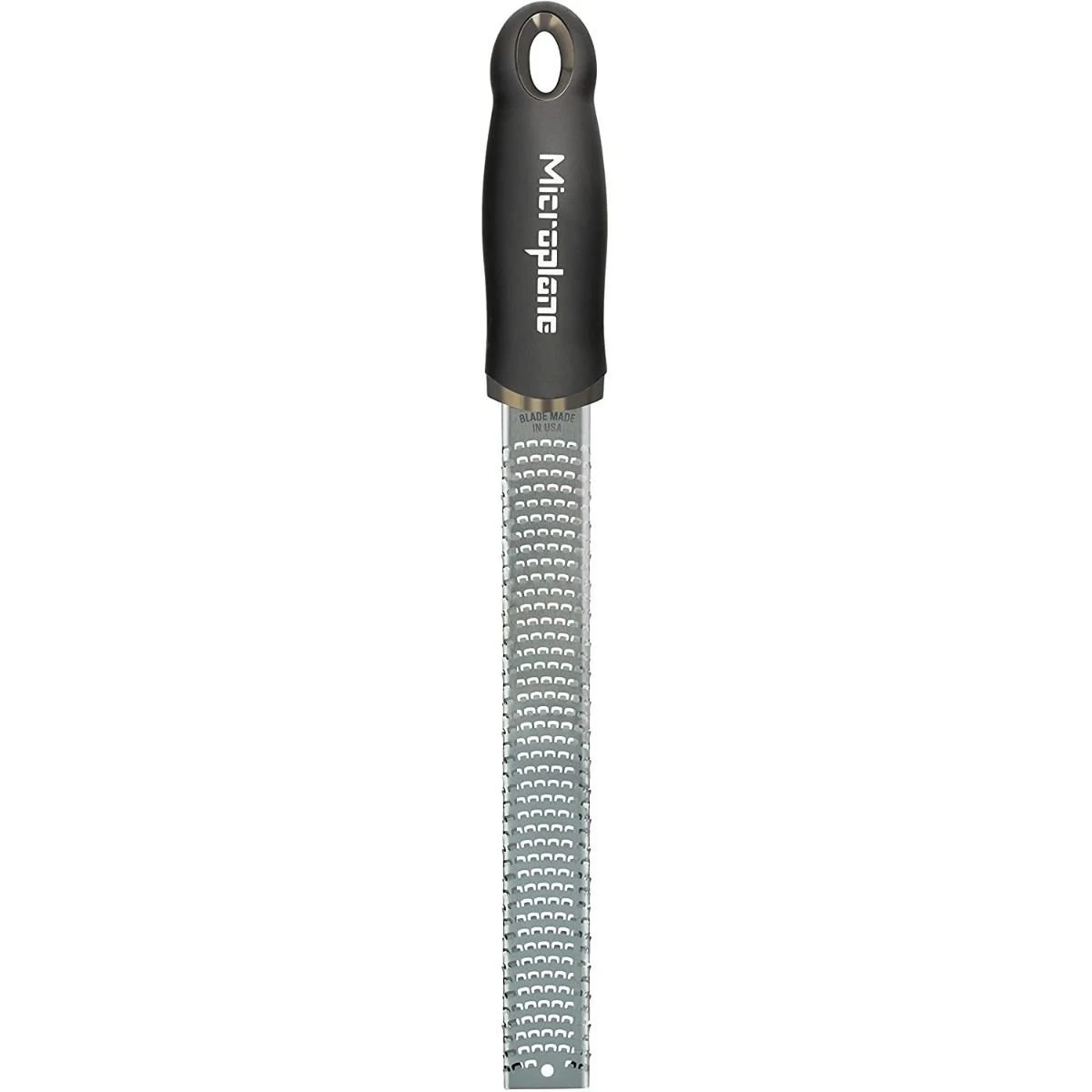 The Microplane Premium Series Zester & Grater Black has moved from the workshop to the kitchen. The iconic long, narrow rasp-style design is made of a surgical grade stainless steel blade with a comfortable soft-touch handle and non-scratch end tabs to grate even the hardest Parmesan Reggiano cheese. Hold the lemon in one hand and the Zester with the side up as if it were the neck of a violin. The zest collects in the upper channel with lacy fine shavings of zest–no more grated knuckles!Â