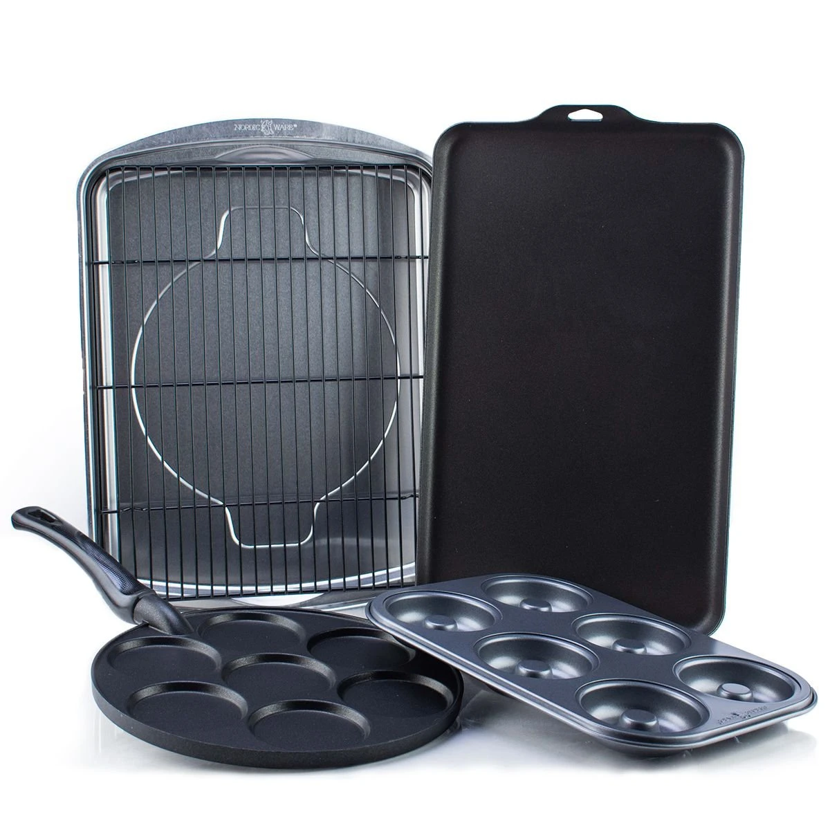 When the weekend finally rolls around, celebrate your morning & surprise your family with a table full of fluffy pancakes, cheesy omelets, glazed donuts, and crispy bacon with the Nordic Ware Weekend Breakfast Set! This set includes Nordic Ware’s Original Silver Dollar Pancake Maker that makes seven 3” silver dollar pancakes at a time, a Two Burner Griddle King with a spacious 17” x 10” surface for cooking multiple servings of eggs to each guest’s exact preference, an Oven Bacon Rack that includes a rack & tray to catch drippings while baking large batches of crispy bacon, and a Nonstick Donut Pan that bakes six donuts at a time. All items included in this set are finished with a nonstick coating for smooth food release & easy cleanup and are backed by a 10-year manufacturer’s warranty ensuring they’ll last you many years of cooking up delicious breakfasts & precious memories with your friends & family!