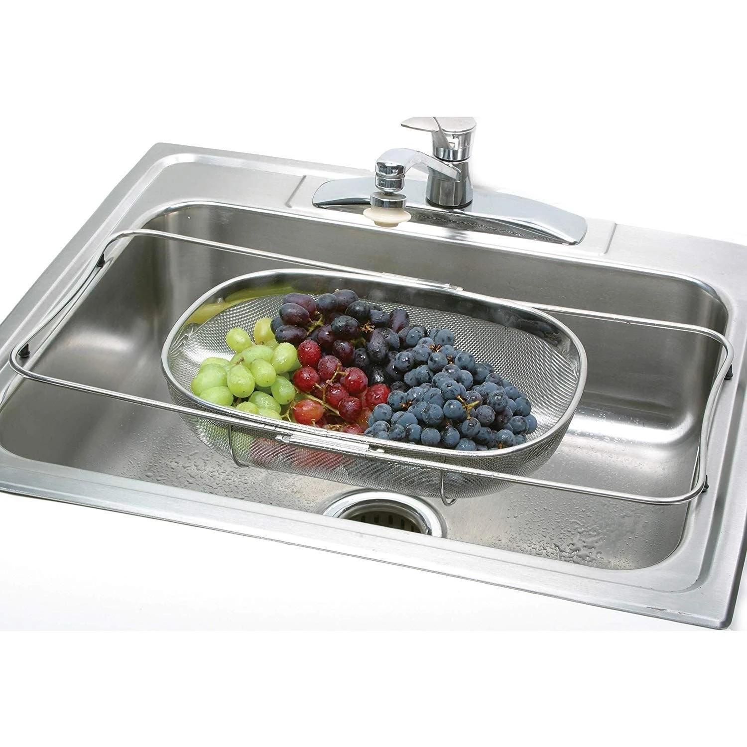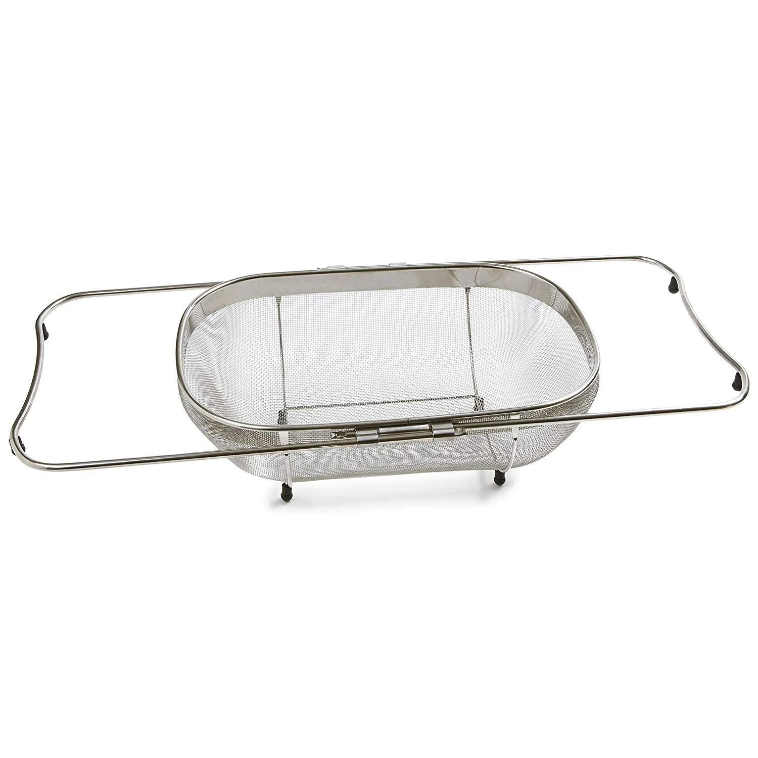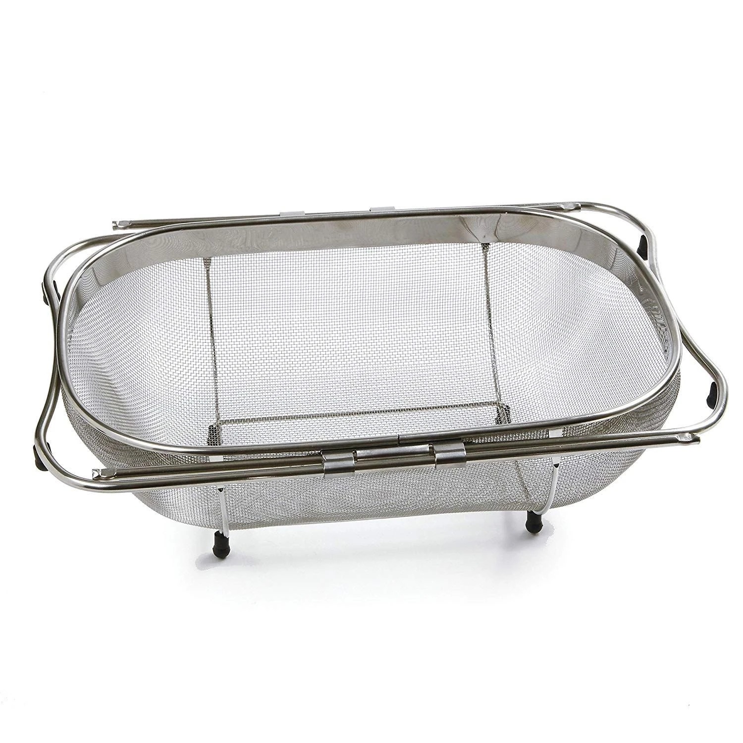 - The two locking handles can be extended to straddle the sink for easy draining and rinsing