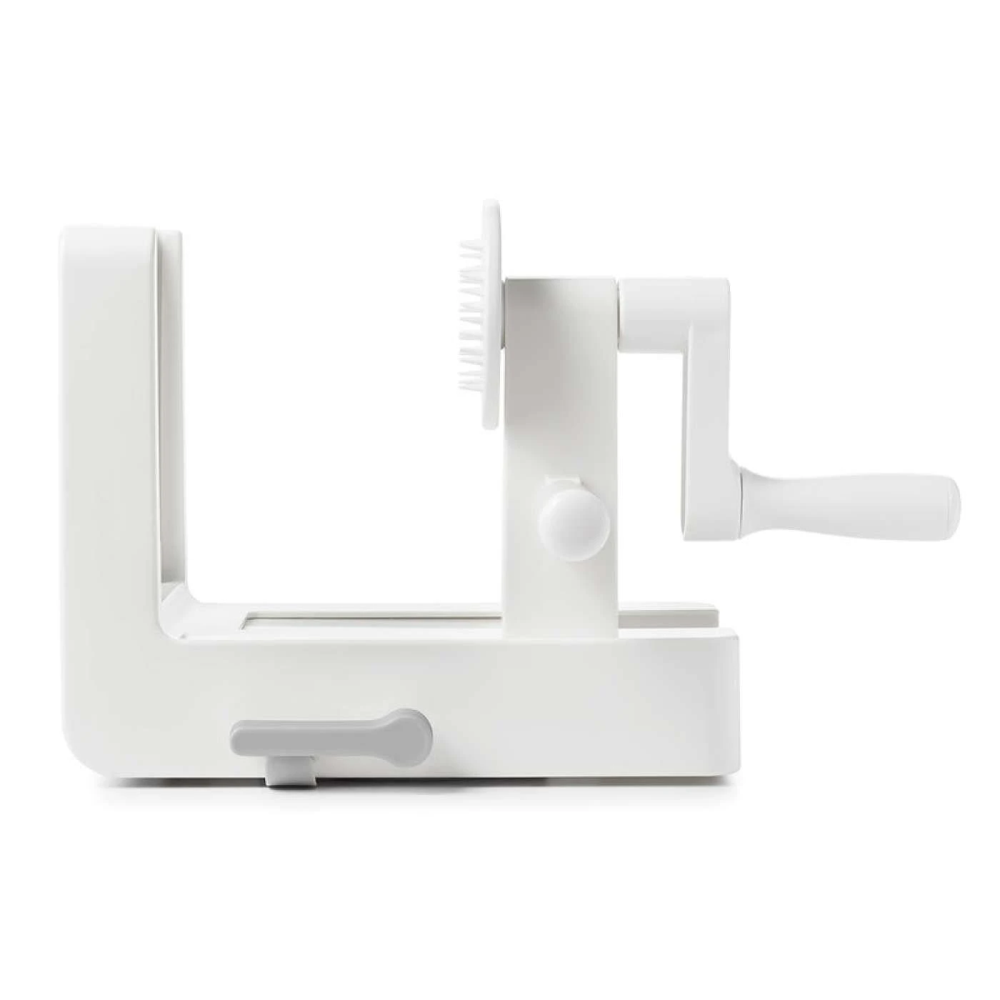 Feed your loved ones deliciously healthy vegetables in fun and creative ways with this OXO Good Grips 3 Blade Tabletop Spiralizer! This 3 blade spiralizer comes with the spaghetti cut blade, fettuccine cut blade, ribbon cut blade, a base with a hand crank, and a blade box that fits onto the board for easy storage.