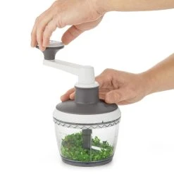 Make short work of vegetables, herbs, and more with the Progressive High-Speed Manual Mini Chopper! This chopper is great for chopping garlic, mincing cilantro, and even pureeing tomatoes for perfect salsa! Designed with ease of use in mind, this mini chopper is equipped with a soft grip lid and a non-skid base. Durable stainless steel blades rotate 13 times for every 1 turn of the handle, and the sweeper bar lifts food back towards the blades for maximum efficiency. Cleaning couldn’t be easier with detachable, dishwasher-safe parts. Chop, mince, and puree with ease with your new Progressive High-Speed Manual Mini Chopper! Â