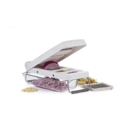 Chop, dice, and mince your fresh produce with Progressive’s PL8 Professional Chopper! This professional food chopper has three stainless steel blade settings. The 1/2″ chopping blades are ideal for blocks of tomatoes, mangoes, and ham. The 1/4″ dicing blade tackles all of your onion, carrots, and salsa ingredients. Finally, the 1/8″ blades are for mincing stronger produce, such as garlic or spices. Chop the produce directly over a cutting board or into the removable bin that’s included with the chopper. Progressive’s PL8 Profession Chopper is an excellent device to eliminate food preparation time and restaurant-styled cuts.