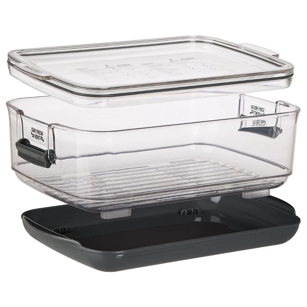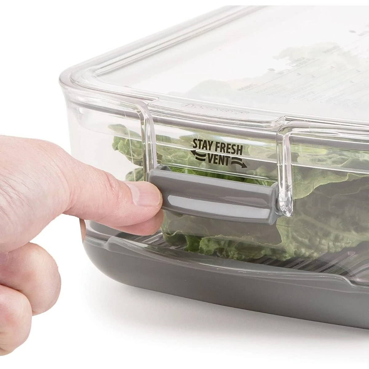- Stay fresh vent tab on each side, allows air to flow through the container
