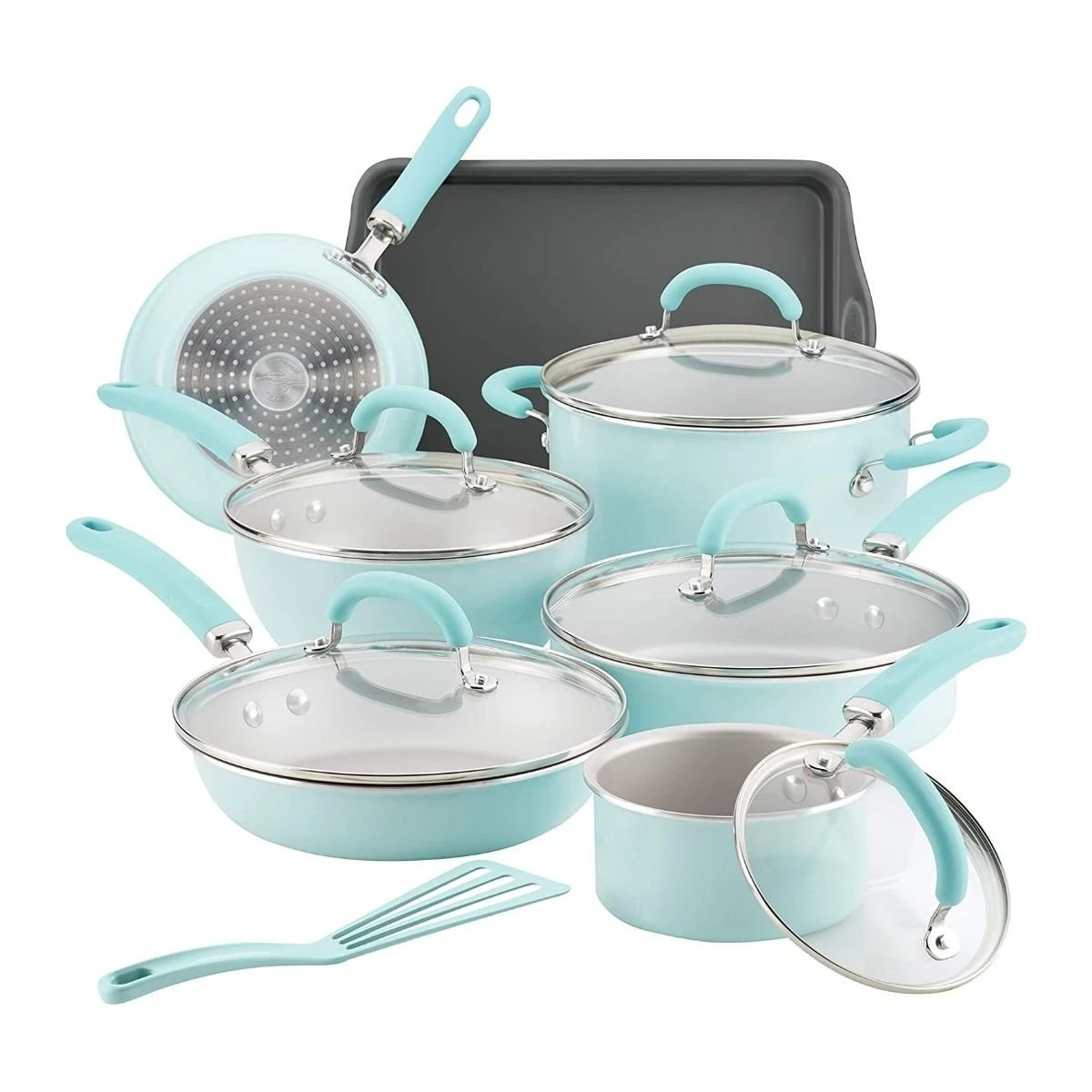 Kick-off your cooking in style! The Rachael Ray Light Blue Shimmer 13-Piece Enameled Cookware Set is a fantastic addition to your kitchen with its functionality and decorative look. This 13-piece set comes with all the essentials needed to prepare breakfast and dinner any day of the week. This versatile set includes an 8.5″ deep fry pan, 10.25″ deep fry pan with lid, 3-quart everything pan with lid, 1.5-quart saucepan with lid, 3-quart saute pan with lid, and a 6-quart stockpot with lid. Additional accessories included a large 9″ x 13″ baking sheet to warm dinner rolls or make chocolate chip cookies and a nylon turner to cook with.