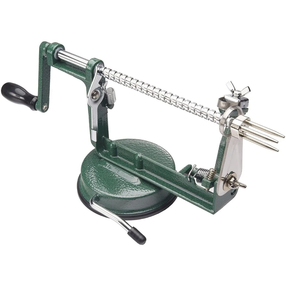 Make quick work of coring, peeling, and slicing with the Roots & Harvest Apple/Potato Peeler! This peeler is able to peel only, slice and core only, or peel, slice, and core all at once. The suction base securely attaches to the counter by engaging the side lever, and the crank handle is ergonomic, making it comfortable and easy to use. Three sharp prongs spear the fruit or vegetable and hold it in place while the blade turns. To clean, simply disassemble the product, rinse it in warm water, and dry immediately. Whether you’re baking an apple pie, making curly fries, or simply peeling a potato, simplify the process with the Roots & Harvest Apple/Potato Peeler!Â