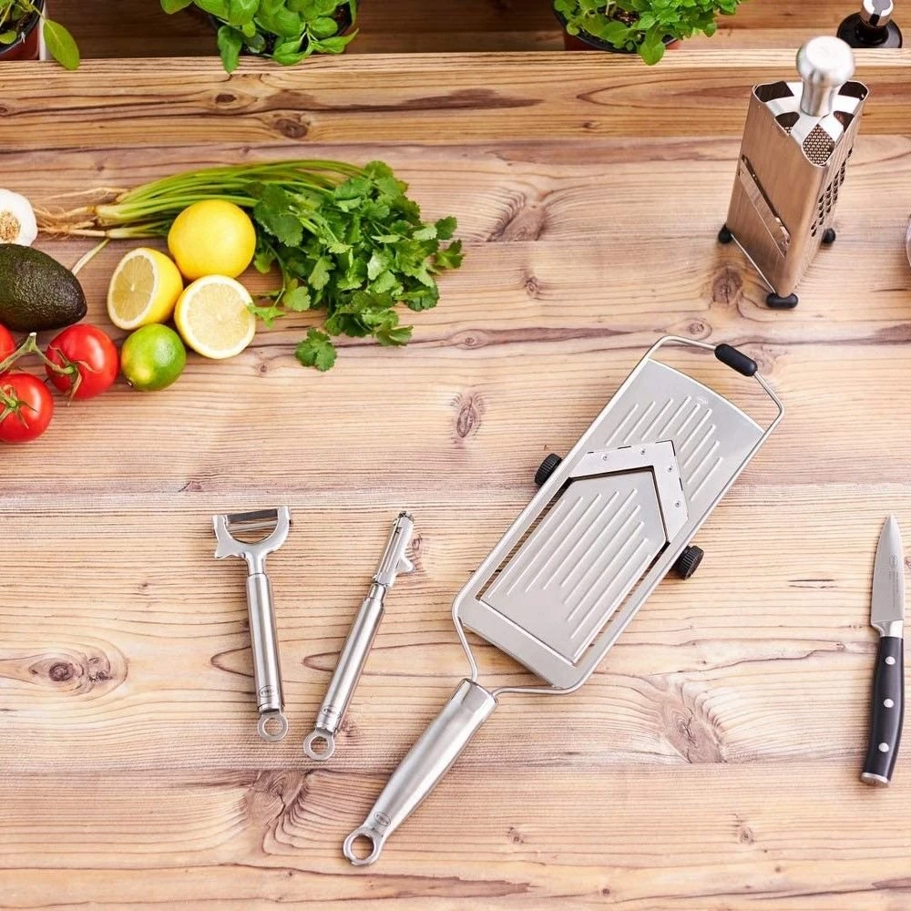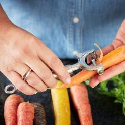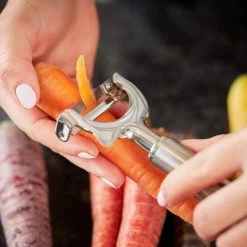 One of Rösle’s superb kitchen tools, this wide fruit and vegetable peeler is suitable for both right- and left-handers and has a flexible swivel head for contouring to potatoes, carrots, apples and more. Like all Rösle tools, utensils, and Open Kitchen storage components, the peeler is made of 18/10 stainless steel for rustproof beauty and long-lasting durability. The round handle has a satin finish to conceal finger marks. It’s sealed against water and has a hanging ring so the peeler can be conveniently stored on a hook in Rösle’s Open Kitchen system of basic rails and Gridwalls or hung on any hook or peg. The peeler is sturdy, balanced, and exceptionally comfortable in the hand. All Rösle products are dishwasher-safe, and carry a lifetime warranty against defects.Â