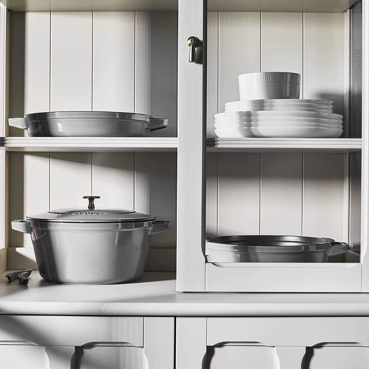 - Crafted from Staub’s signature enameled cast iron in versatile, neutral graphite grey