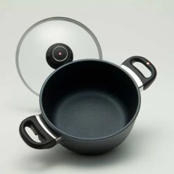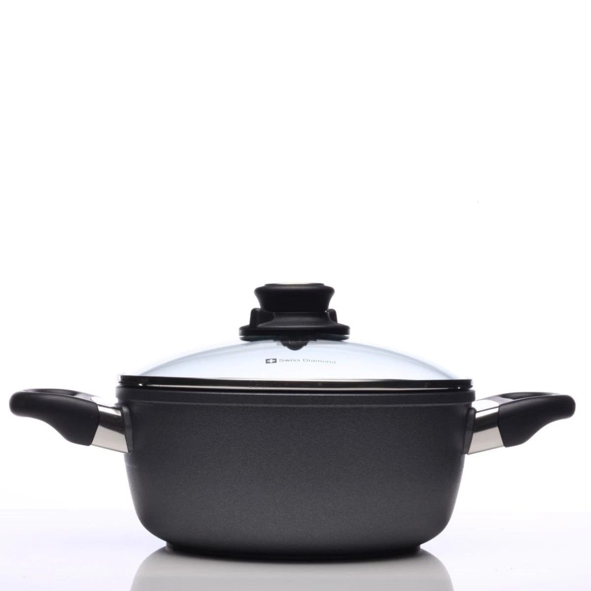 This Covered Casserole is 8â and has two side handles with a vented metal-rimmed heat tempered glass cover and is perfect for frying, casseroles, and chilies. This Swiss Diamond Casserole Pan is also a great pan to start on the stove, finish in the oven, and then serve in, since it is oven safe up to 500 F. Swiss Diamond is an award winning line of cookware, combining real diamond crystals with the non-stick nano composite, forming a virtually indestructible non-stick surface.Â
