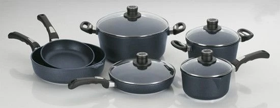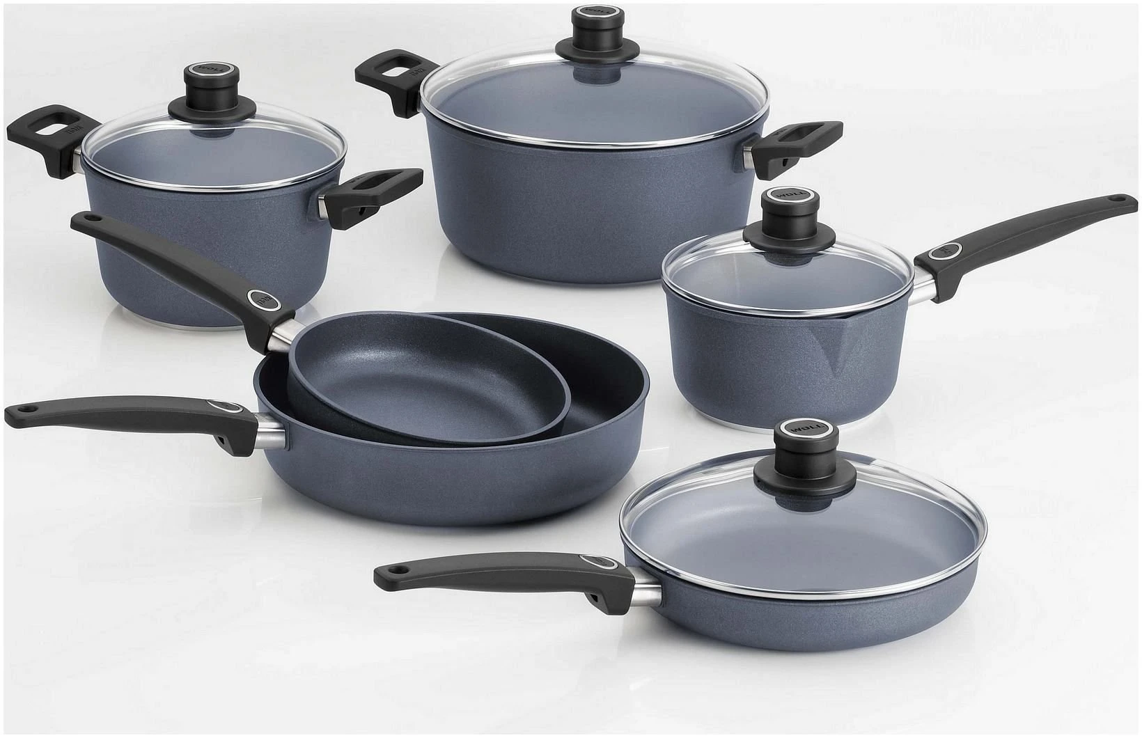 The Woll Diamond Plus Induction Cookware Set (SET10DPI) includes 10 essential cookware piecesâ6 pots/pan and 4 lidsâ from the Diamond Plus Induction line, fit for everyday kitchen and cooking tasks like frying eggs, sautĂ©ing onions, melting butter, making tomato sauces, and cooking soups and stews. The diamond-coated interiors of these Woll pots and pans make cleanup a breeze; aluminum bodies with flat bottoms promote even cooking all across each cooking surface.